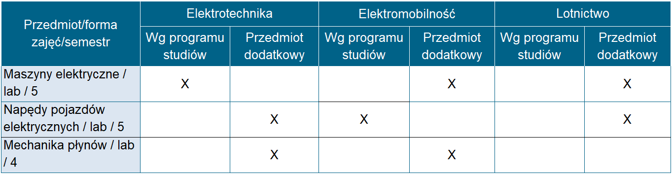 Elektrotechnika (sem. 4), Elektromobilność (sem. 4) i Lotnictwo (sem. 4)